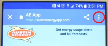 1. Use a web browser on your Android Phone to go to AustinEnergyApp.com and then tap on the “3 dot” menu icon of your Android Phone screen.